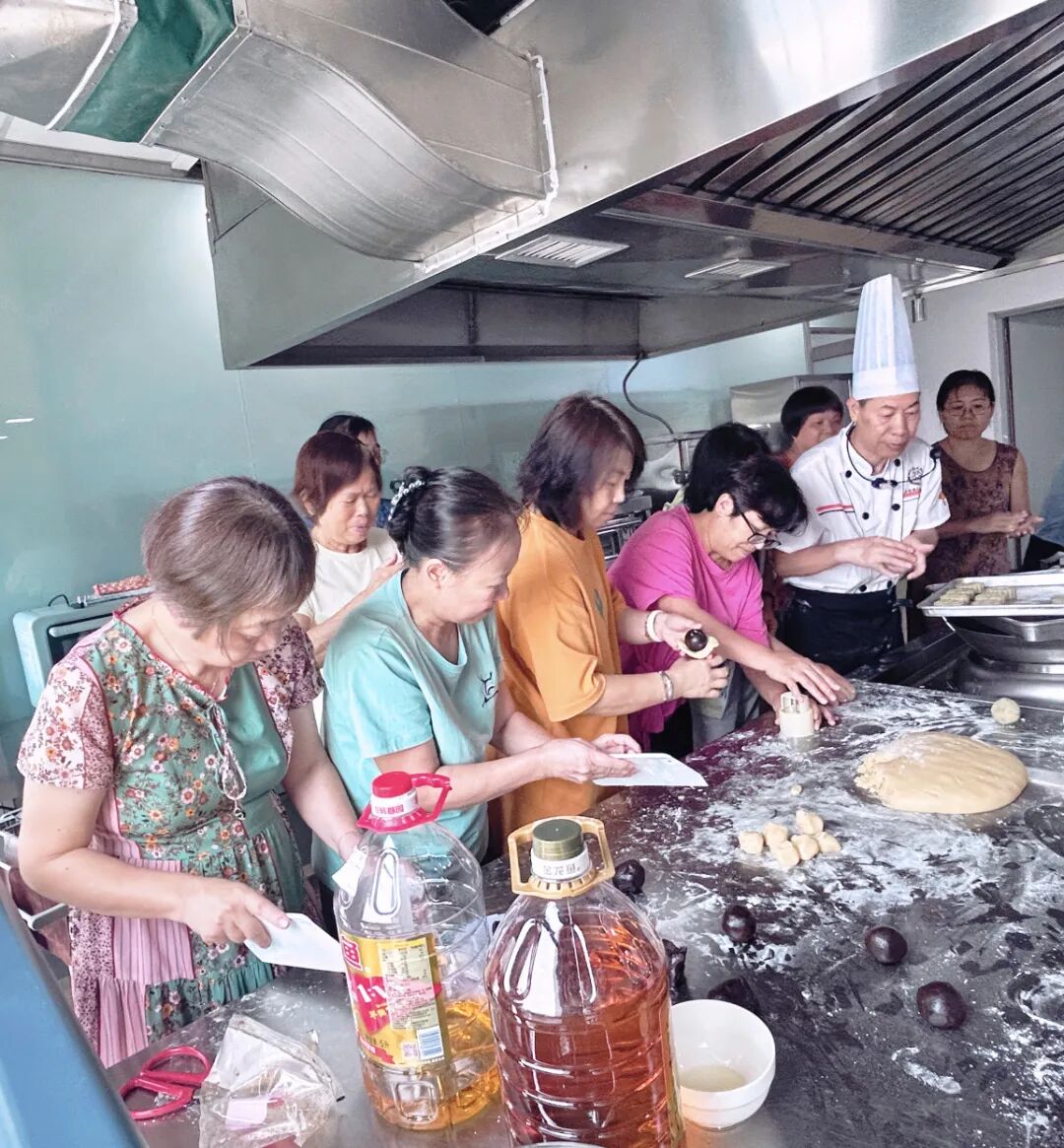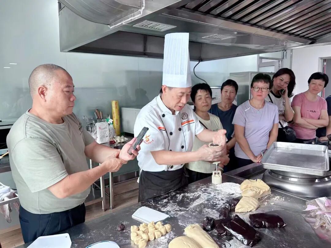 月饼制作活动伊始,老师详细讲解了广式月饼的制作步骤与技巧,从饼皮的揉制、馅料的包裹,再到模具的按压成型,每一步都凝聚着传统手艺的匠心。学员们认真观摩、相互协作,在老师的耐心指导下,将面团与馅料一步步变成精致可口的月饼。