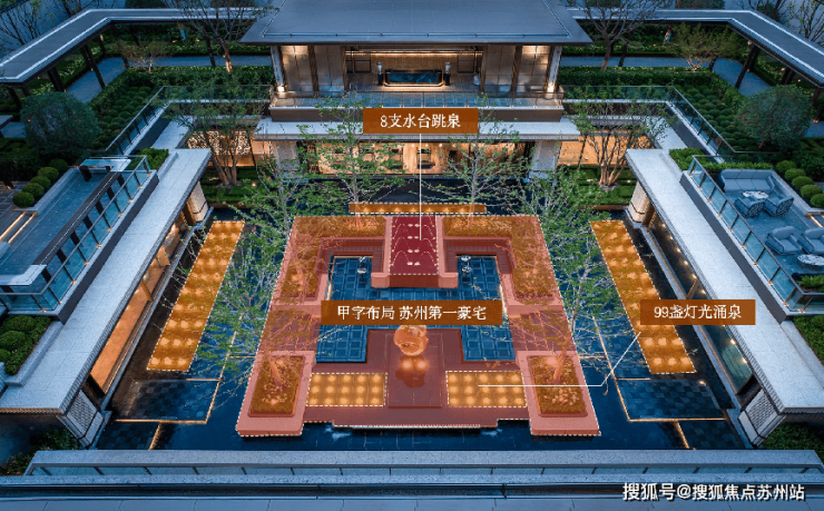 酒店式5大景观空间布局:酒店式入口(车马院)、酒店式礼序水院(音泉光厅)约25米的蓝翡翠奢石水景,取鉴西班牙阿尔罕布拉宫仪式水轴,意大利托斯卡纳夹景设计手法;720㎡下沉式庭院——浮岛花园,奢石打造的8支水台跳泉,配合99盏灯光涌泉,借鉴了意大利法尔奈斯庄园设计,且形成巧妙的甲字布局,寓意苏州第一;酒店式风雨连廊(光影花厅)、蒙特梭利儿童乐园,十大趣味主题,自然式的高知育教场景