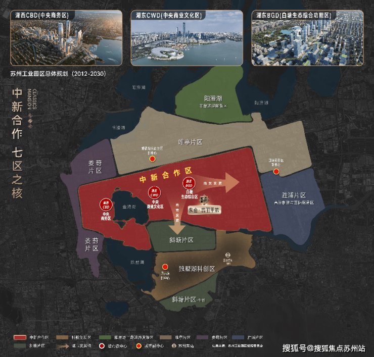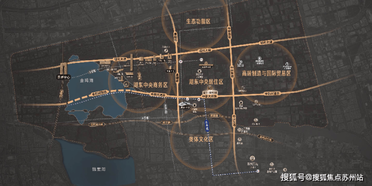 2轴:现代大道——地标建筑轴,有东方之门、圆融广场、摩天轮、博览中心等,勾勒出园区现代化的璀璨天际线;中新大道——城市发展轴,是园区自西向东发展的价值金轴,豪宅聚落的格局所在。